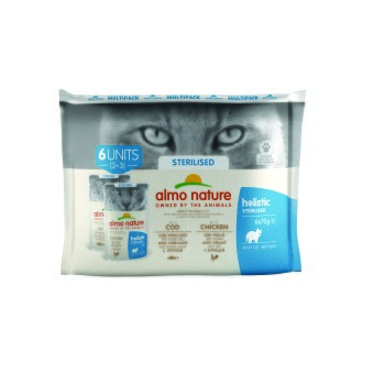 Kastrierte Katzen neigen aufgrund reduzierter motorischer Aktivität häufig zu Übergewicht: Man schätzt, dass der Kalorienbedarf nach der Kastration um bis zu 30% abnimmt. Holistic Sterilised MultiPack kombiniert ein Nassfutter, das am besten für die Bedürfnisse kastrierter Katzen geeignet ist und täglich alle benötigten Nährstoffe liefert mit dem Komfort eines MultiPacks. Angereichert mit Vitaminen und Mineralstoffen, ohne Farbstoffe oder chemische Konservierungsstoffe zubereitet, bieten die Sorten Holistic Sterilised Wet eine natürliche Flüssigkeitsversorgung und sind dank des limitierten Fettgehaltes ideal zur Gewichtskontrolle. Holistic Sterilised Multipack enthält insgesamt 6 Frischebeutel mit 2 verschiedenen Sorten: mit Kabeljau und mit Huhn.