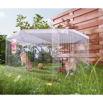 Durch den leichten Auf- und Abbau können Sie das AniOne Freilaufgehege ganz individuell in Ihrem Garten aufstellen und Ihrem kleinen Liebling eine Freude bereiten. Die Vorteile des AniOne Nagerfreigeheges im Überblick: mit seitlicher Tür für eine praktische und einfache Handhabung das Schattendach schützt vor Sonne, Katzen und Greifvögeln nicht rostend einfacher Aufbau die Einzelelemente können durch Clips miteinander verbunden werden Masse: 8 Elemente à je 59 x 58 cm Durchmesser: Ø 120 cm Gitterabstand: 2,6 cm Zulässig für: 2 bis 3 Meerschweinchen oder 2 bis 3 Kaninchen bis 2,3 kg oder 2 Kaninchen bis 3,5 kg Material: Stahl, Nylon Lieferung ohne Dekoration. Dieses Gehege entspricht den Vorschriften der schweizerischen Tierschutzverordnung. Eignet sich nicht als dauerhafte Aussenhaltung, sondern nur als Freigehege. Für eine artgerechte Haltung ist es zwingend erforderlich, dass die Tiere täglich zusätzlich einen kontrollierten Freilauf erhalten.